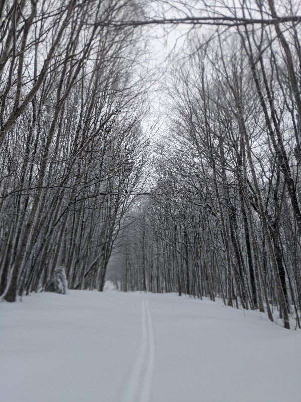 By Monday morning, the temperature has dropped. The cold, aided by a steady breeze, has dried out the snow. It always amazes me how that happens. Again I ski along the mountain ridge, but this time I go further, time and again passing the point I’ve identified as my turn around. The snow is so good. It whispers under my skis. The trees emit cracks and pops in the cold. It’s almost a conversation.